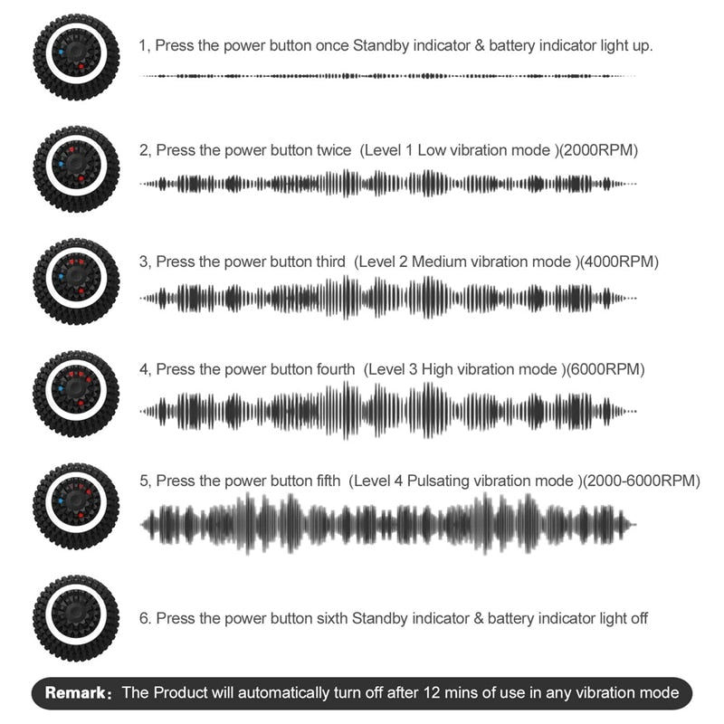 Four vibration modes: Low, Medium, High, and Pulsating to enhance blood flow, release tension, and reduce soreness