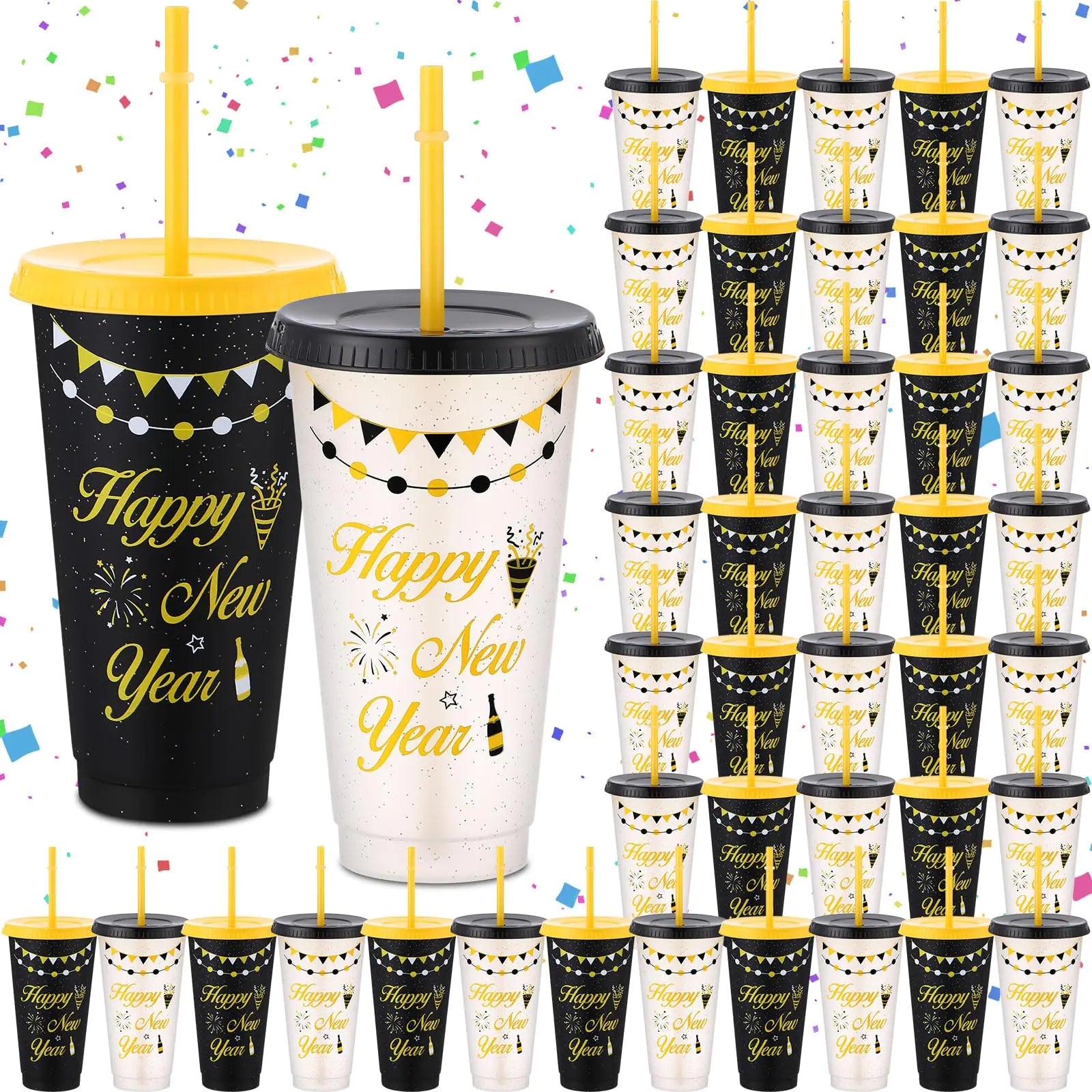 Ring in the New Year with these vibrant party cups! Designed to fit most car cup holders, they’re perfect for on-the-go celebrations or home parties. Made from sturdy plastic, each cup holds up to 24 oz of your favorite drinks or treats, adding sparkle and convenience to your festivities. Featuring two festive color schemes—black and clear—these cups come with matching lids and straws for easy sipping and reduced spills.